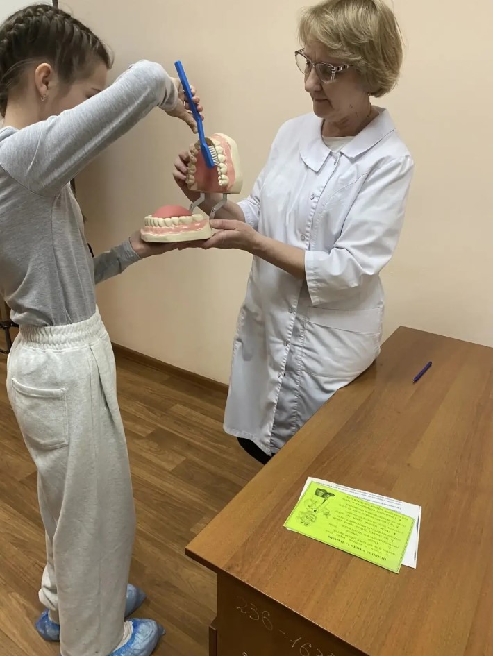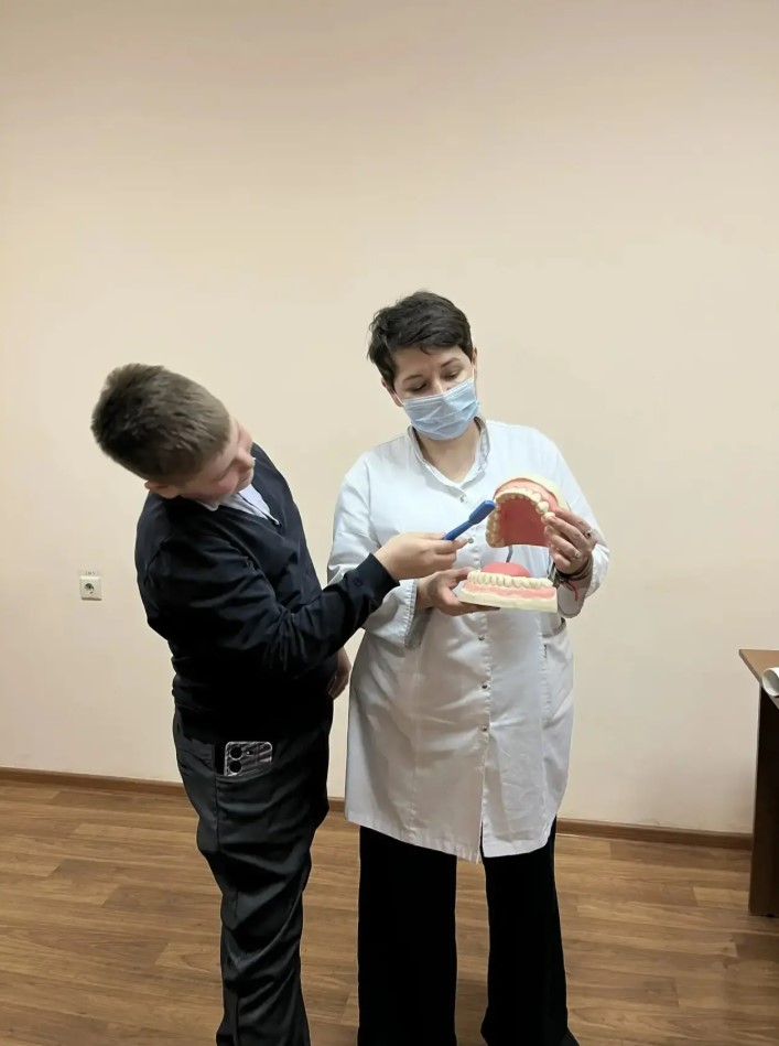 Самый зрелищный этап прошел на демонстрационной модели: детям наглядно показали технику чистки, а затем каждый школьник смог попрактиковаться и закрепить навык самостоятельно.