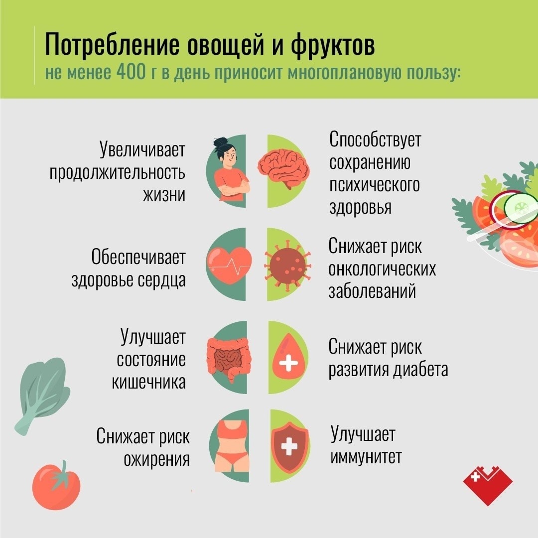 Овощи и фрукты — важный источник клетчатки, нужной для правильной работы кишечника. Кроме того, клетчатка помогает снизить уровень «плохого» холестерина, что уменьшает риск развития диабета и заболеваний сердца и сосудов.