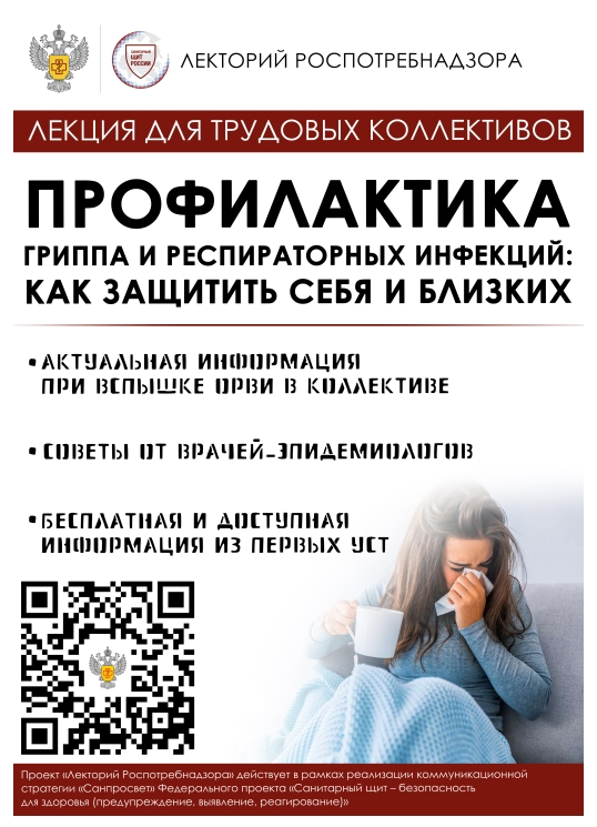 В целях минимизации рисков распространения ОРВИ в период сезонной заболеваемости предлагаем Вам просмотреть предоставленную лекцию. Запись доступна для просмотра по ссылке: https://file.fcgie.ru/SANPROSVET_lektoriy_1 или с помощью прилагаемого QR-кода.