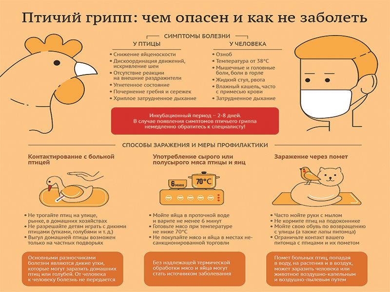 Заражение человека и домашней птицы происходит при тесном контакте с инфицированной и мертвой дикой и домашней птицей. В ряде случаев возможно заражение человека при употреблении в пищу мяса и яиц больных птиц без достаточной термической обработки.